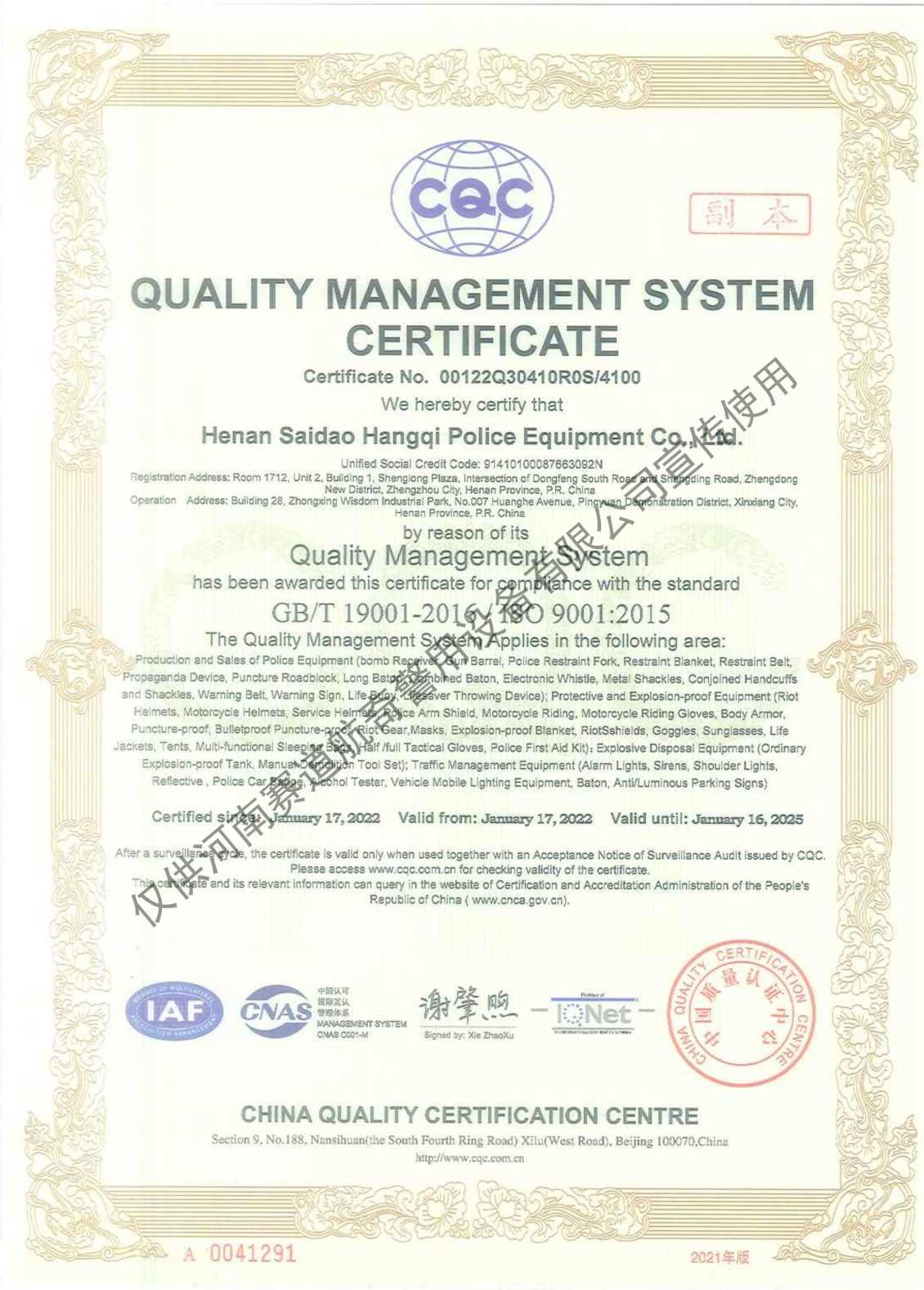 质量管理体系认证证书